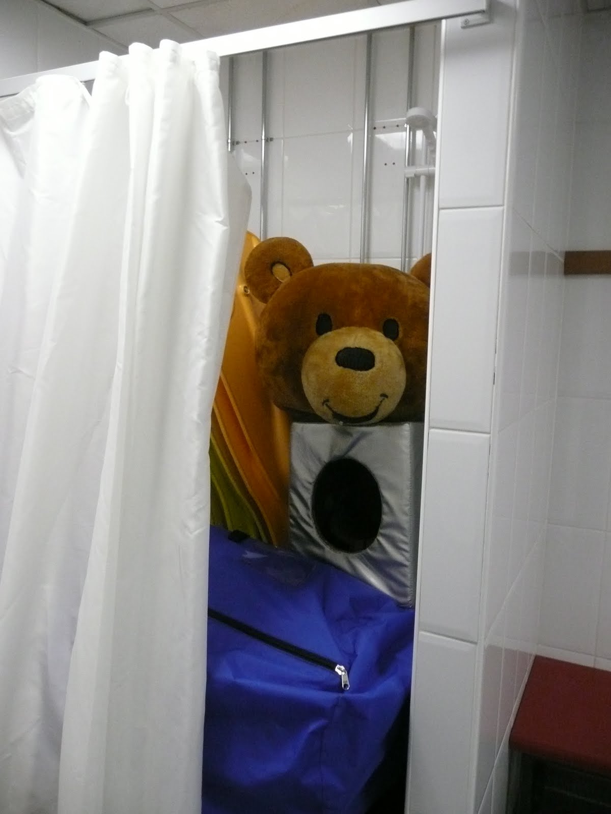 Meanwhile the other mascots, the furry ones, seem to have spent the summer hiding in the shower. I share a changing room with Bubbles and Herbie. It always makes me laugh when I arrive to see their heads sitting patiently waiting for the human inhabitants to arrive.And always smiling.